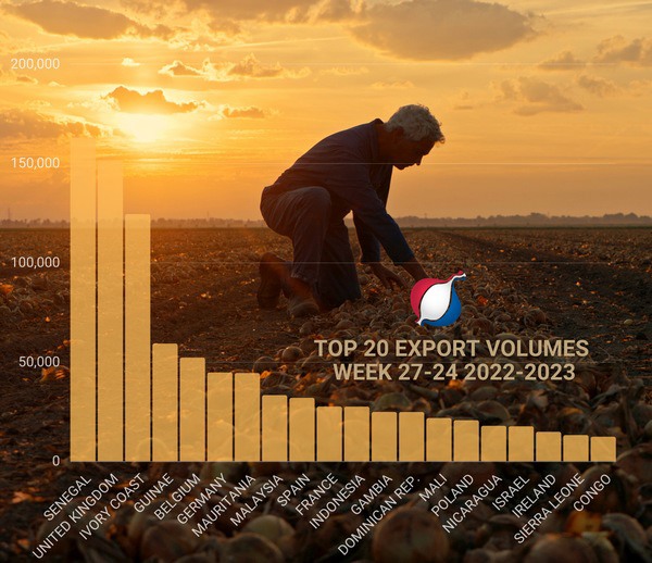 Hervorzuheben ist auch der (erneute) Einstieg Israels auf Platz 17 mit über 17.000 Tonnen. Brasilien verdoppelte seine Importe in dieser Saison auf 8.500 Tonnen, bleibt aber außerhalb der Top 20. Abgesehen von Indonesien (mit einem Zuwachs von über neun Prozent) und der Dominikanischen Republik (mit einem Zuwachs von 57 Prozent) haben alle anderen entfernten Bestimmungsländer aufgrund der knappen und außergewöhnlich teuren niederländischen Zwiebeln für diese Länder in dieser Saison deutlich verloren. Trotzdem hat die holländische Zwiebel in dieser Exportsaison 130 verschiedene Endbestimmungsorte erreicht.