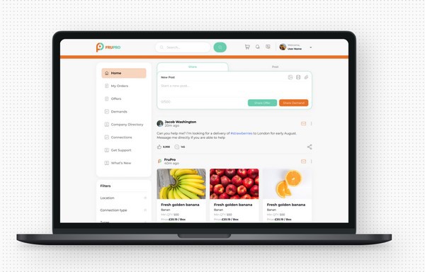 Im Jahr 2021 begannen Will Hill und sein Geschäftspartner Ollie Morley-Fletcher, ihren digitalen Marktplatz FruPro zu testen. Seit der Testphase ist viel Zeit vergangen und durch die Zusammenarbeit mit den Nutzern hat sich die Plattform enorm verbessert. Derzeit nutzen 198 Unternehmen aus 15 Ländern die Plattform, und im Monat Juli waren 54 Unternehmen aktiv. FruPro konnte auf die Investitionen vieler Branchenakteure zählen, die daran glaubten, dass FruPro eine Plattform entwickelt, die den Handel mit Obst und Gemüse erleichtert.