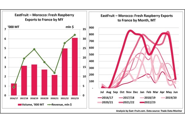 Laut EastFruit hat Marokko, basierend auf den Ergebnissen der Saison 2022/23, einen neuen Rekord für den Export von frischen Himbeeren nach Frankreich aufgestellt, einem Land, das für seine Vorliebe für lokale Produkte bekannt ist. Darüber hinaus haben die marokkanischen Produzenten am meisten zum Gesamtwachstum der frischen Himbeerimporte in Frankreich beigetragen.