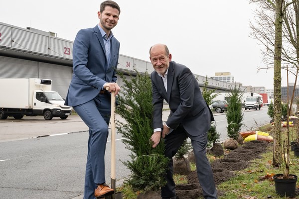 Den ersten Spatenstich setzen Hans Peter Schneider (Geschäftsführer der M3B GmbH) und Lars Jansen im Frischezentrum gemeinsam. Gepflanzt wird eine Mischung aus Blüh- und Beerensträuchern wie der Stechpalme und der Felsenbirne. „Damit schaffen wir zusätzlichen Lebensraum für Insekten und Vögel, die dort Futterquellen und Nistmöglichkeiten finden, und steigern so die Biodiversität. Jeder Quadratmeter zählt, da für viele Tierarten der Lebensraum in der Stadt knapp ist“, sagt Jansen. Hans Peter Schneider ergänzt: „Mit den gut 480 Büschen und Sträuchern schaffen wir zusätzlichen Grünraum in der Überseestadt. Doch der Spatenstich heute hier auf dem Großmarkt ist der erste Schritt. Wir suchen bereits nach weiteren Flächen auf dem Großmarkt, die wir begrünen können.“