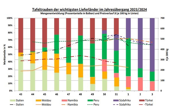 Südafrikanische Tafeltrauben herrschten augenscheinlich vor, Importe aus Namibia und Peru spielten nur eine ergänzende Rolle. Chilenische Partien, in Schalen vorverpackt, wurden in der Regel direkt an den LEH weitergeleitet. Die Anlieferungen hatten sich insgesamt ausgedehnt. Die Nachfrage hielt damit laut BLE nicht immer Schritt; die frostigen Temperaturen sowie der Schneefall hatten die Unterbringungsmöglichkeiten merklich eingeschränkt.