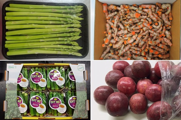 Auszug aus dem Sortiment der Körner Agro. Im Uhrzeigersinn: Grüner Spargel, Kurkuma, Passionsfrüchte der Sorte Tainong und Okra. Die Saison bei den Passionsfrüchten läuft nun langsam aus. Ab April startet man sukzessive mit Rambutan und Mangostan.