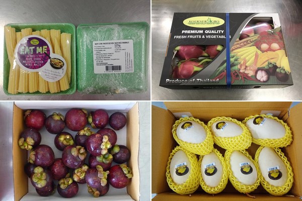 Thailändische Erzeugnisse. Im Uhrzeigersinn: Babymais, Pitahaya bzw. Drachenfrucht, Nam Dok Mai-Mangos und Mangostan.