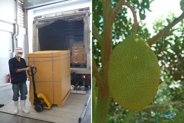 Links: Verladung im Ursprung, rechts: Jackfrucht am Baum.