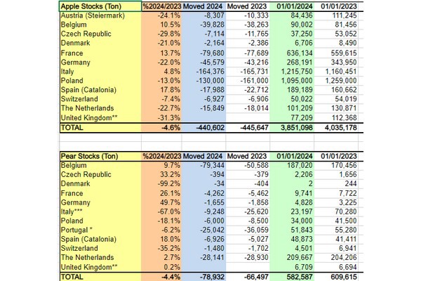 Der gesamte europäische Apfelbestand ist im Vergleich zum Vorjahreszeitraum um 4,6 Prozent gesunken. Den größten Rückgang verzeichnete das Vereinigte Königreich mit -31,3 Prozent, gefolgt von der Tschechischen Republik mit -29 Prozent und den Niederlanden mit -22,7 Prozent. Zuwächse gab es in Spanien mit +17,8 Prozent, Frankreich mit +13,7 und Belgien mit +10,5.