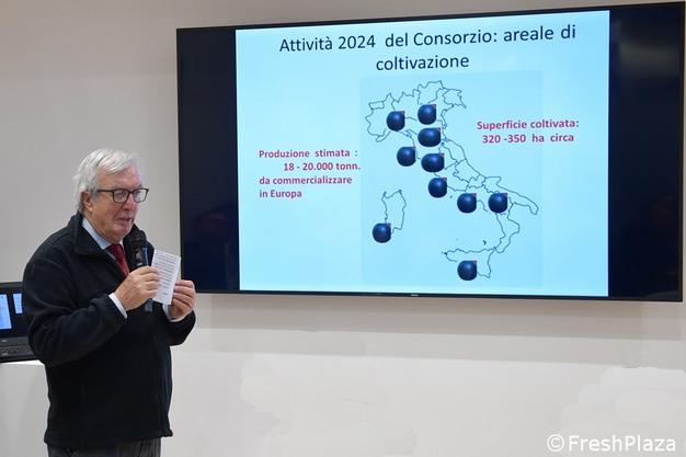 Während der jüngsten Ausgabe der Fruit Logistica fand eine Präsentation statt, an der der Präsident des Konsortiums Roberto Castello (Ortofrutta Castello), Carmine Alfano (Alma Seges), Stefano Rossi (Lorenzini Naturamica), Matteo Mazzoni (Gruppe Cico-Mazzoni), koordiniert von Luciano Trentini, Direktor des Konsortiums, teilnahmen.