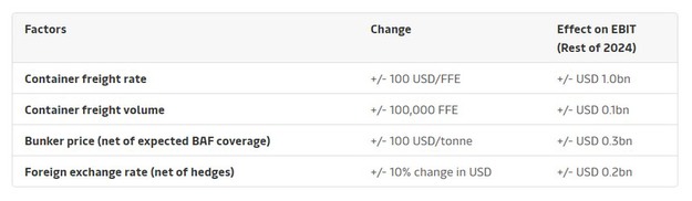 Die finanzielle Leistung von A.P. Moller - Maersk für das Jahr 2024 hängt von mehreren Faktoren ab, die mit Unsicherheiten behaftet sind und mit unsicheren makroökonomischen Bedingungen, Bunkerölpreisen und Frachtraten zusammenhängen. Unter sonst gleichen Bedingungen sind die Sensitivitäten für 2024 für vier Schlüsselannahmen unten aufgeführt: