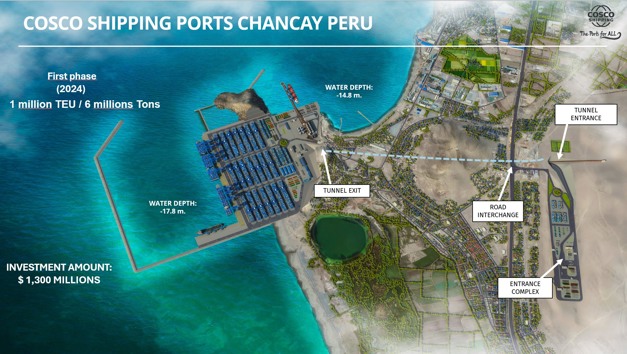Der WSA3-Dienst, der verschiedene Häfen in China mit Häfen in Mexiko, Peru und Chile verbindet, wird seinen derzeitigen Halt im Hafen von Callao nach Chancay verlegen. Das wird durch einen neuen direkten Dienst zwischen dem Hafen von Chancay und Shanghai mit einer Ankunft pro Woche ergänzt. Das Projekt wurde 2009 konzipiert und der Bau begann 2018. In den vier Phasen werden insgesamt rund 3,6 Milliarden Dollar investiert.