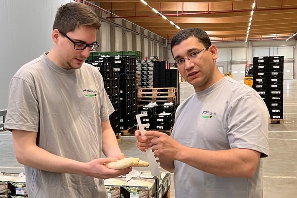 Leo Zastrow (l) und Hugo Da Mota verantworten den Vertrieb des regionalen Spargels beim Pfalzmarkt.