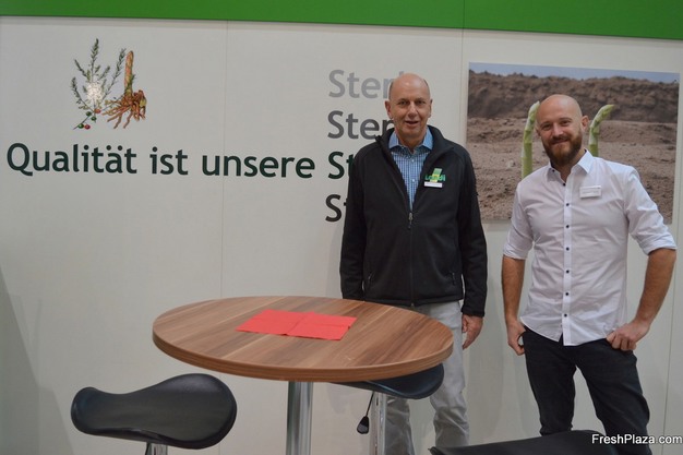 Rudolf Grunder (links) mit seinem Kooperationspartner Christoph Sterk von Sterk Spargelpflanzen auf der expoSE 2023. Die Regeneration der Spargelpflanzen habe immer einen großen Stellenwert, betont der Spargelexperte.