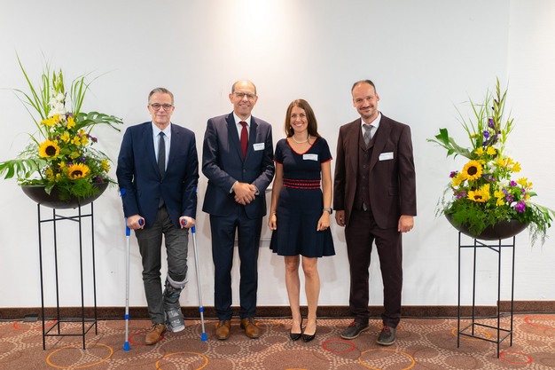 Aufsichtsratsvorsitzender Frank Werner (links) und die beiden Vorstände Dr. Dietmar Kohlruss (2.v.l.) und Christian Senft (rechts) begrüßen Karin Hagdorn als neues Aufsichtsratsmitglied.