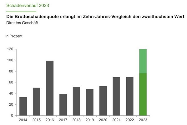 Die Extremwetterereignisse des vergangenen Jahres spiegeln sich auch in der Schadenbilanz der Gartenbau-Versicherung wider: Mit 76,3 Prozent erreichte die Bruttoschadenquote im direkten Geschäft den zweithöchsten Wert im Zehn-Jahres-Vergleich. Verantwortlich dafür waren schwere Hagelereignisse in Deutschland, Italien und der Schweiz, aber auch Überschwemmungen in Griechenland, ein Mittelmeerzyklon über Sizilien und das Sturmtief Ciarán über der Bretagne. Der am stärksten belastete Versicherungszweig war Hagel mit einer Bruttoschadenquote von 119 Prozent. Auch das indirekte Geschäft verzeichnete 2023 eine deutlich höhere Bruttoschadenquote.