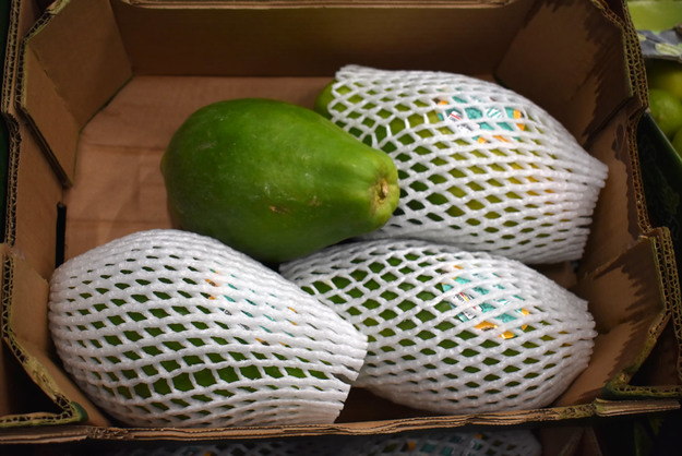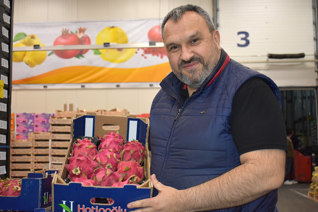 Hüseyin zeigt die violettfarbenen Drachenfrüchte aus der Türkei.