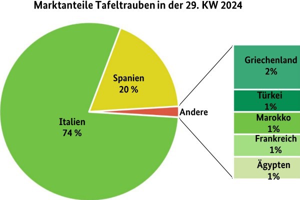 Das europäische Traubenangebot fächerte sich derweil auf, denn aus Italien und Spanien kam inzwischen eine Vielzahl an Varietäten. Italienische Victoria und Black Magic überwogen dabei, gefolgt von Sugra- und Arra-Varietäten. Stark nachgefragt wurden laut BLE weiterhin die hellen und roten kernlosen Sorten, die in einwandfreier Optik und köstlichem Aroma mehrheitlich zwischen 3,60 und 4,40 EUR pro Kilo kosteten und die Kunden überzeugten. Mit der roten Red Globe hatte Italien eine neue Varietät im Programm. In Frankfurt starteten blaue Prima aus Frankreich im 5-kg Karton zu vergleichsweise günstigen 20 bis 24 EUR in die neue Kampagne. In Berlin konnte wieder auf italienische Michele Palieri zugegriffen werden. Bei einem insgesamt recht üppig bestückten Markt waren Preisnachlässe kaum zu umgehen, wenngleich das sommerliche Wetter und der damit verbundene Umschlag positiv ausfielen. Kommende Woche werden italienische Crimson Seedless und Italia erwartet.