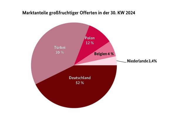 Die Kirschensaison bog auf die Zielgerade ein: Die Verfügbarkeit schränkte sich augenscheinlich ein. Inländische Früchte überwogen dabei noch, verschwanden verschiedentlich aber bereits aus der Vermarktung. Die Qualität konnte in der Regel überzeugen. Hochwertige und großkalibrige Produkte waren des Öfteren knapp, sodass sie sich verteuerten; mitunter stiegen die Notierungen auch sehr kräftig an. Türkische Napoleon folgten den einheimischen Offerten von der Menge her. Sie ließen hinsichtlich ihrer organoleptischen Eigenschaften mancherorts Wünsche offen: Ihre Kondition schwächte merklich ab. Daher waren die Verkäufer ab und an zu Vergünstigungen gezwungen. Polnische, belgische und niederländische Abladungen spielten nur eine untergeordnete Rolle. Punktuell verteuerten sie sich, da der Bedarf auf den Märkten mit den deutschen Partien nicht durchgängig befriedigt werden konnte. Generell konnte die Nachfrage zum nahenden Kampagnenschluss durchaus noch als freundlich beschrieben werden.