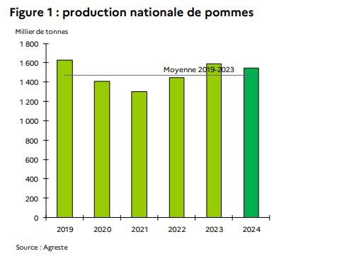 Am 1. August wurde die französische Apfelproduktion für 2024 auf 1.546.900 Tonnen geschätzt, drei Prozent weniger als im Vorjahr. Sie würde damit um fünf Prozent über der durchschnittlichen Produktion der Jahre 2019-2023 liegen.