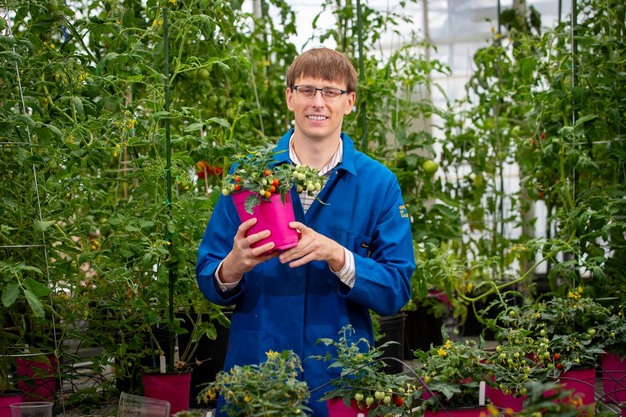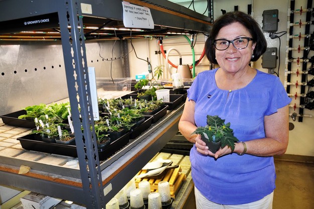 Martha Orozco-Cardena hält eine blühende Tomatenpflanze im Labor. Foto: David Danelski.