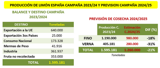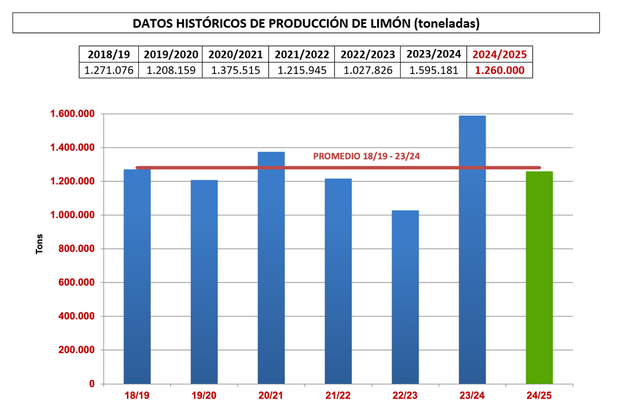 Ailimpo prognostiziert, dass Spanien in der Saison 2024/2025 1.260.000 Tonnen Zitronen produzieren wird, d.h. 21 Prozent weniger als die 1.595.181 Tonnen, die in der Saison 2023/2024 (der bisher größten Zitronenernte) produziert wurden, laut der vorläufigen Bilanz, die die exportierten, verarbeiteten und auf dem heimischen Markt vermarkteten Früchte, Gewichtsverluste und nicht geerntete Früchte berücksichtigt.