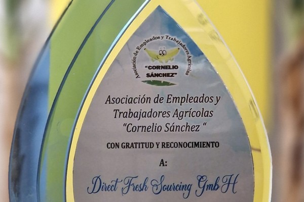 Die Direct Fresh Sourcing GmbH hat am 09.09.2024, im Rahmen einer Hausübergabe des "Verband der landwirtschaftlichen Angestellten und Arbeiter CORNELIO SÁNCHEZ", eine Auszeichnung und Danksagung in Anerkennung für den Direktkauf von Fairtrade Bananen erhalten.