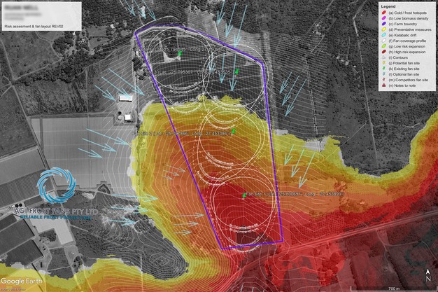 AGI Frost Fans folgt einem Risikobewertungsmodell, das die Topographie sowie Biomassedaten durch Satellitenbilder und Kaltflussanalysen berücksichtigt.