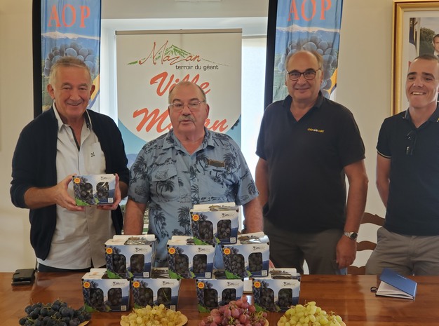 An der Pressekonferenz nahmen René Reynard, Präsident der ODG, Louis Bonnet, Bürgermeister von Mazan, Alexandra Lacoste, Direktorin der Nationalen Traube g.U., Herr Roman, Vertreter des Crédit Agricole und Präsident der örtlichen Niederlassung, und Guillaume Greter, Erzeuger von Muscat du Ventoux g.U., teil.