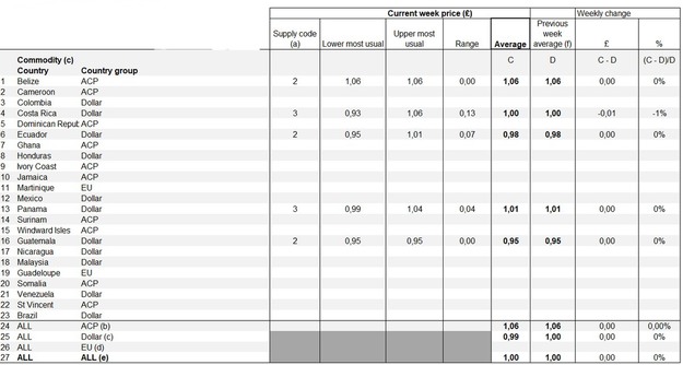 Der aktuelle wöchentliche Durchschnittspreis für Bananen aus Belize lag bei 1,06 £ (1,27 EUR) und damit auf dem Niveau der Vorwoche, während der Preis für Bananen aus Costa Rica in dieser Woche um 1 Prozent auf 1,00 £ (1,20 EUR) fiel. Bananen aus Panama wurden für 1,01 £ (1,21 EUR) pro kg gehandelt, was ebenfalls dem Preis der letzten Woche entsprach. Bananen aus Ecuador wurden für 0,98 £ (1,17 EUR) verkauft, während Bananen aus Guatemala in dieser Woche 0,95 £ (1,14 EUR) kosteten.