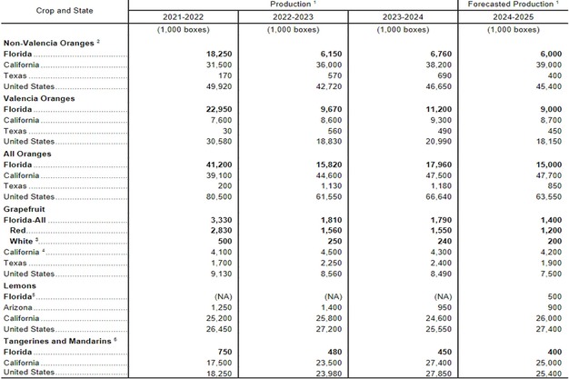 Die Prognose von 15 Millionen Kisten liegt fast drei Millionen Kisten unter der Gesamtproduktion von Zitrusfrüchten aus Florida in der Erntesaison 2023-2024, die 17.960.000 Kisten betrug.