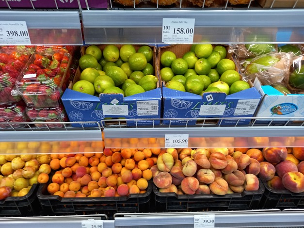 Moldauische Aprikosen und Paraguayos kosten 1,55 bzw. 2,05 EUR pro Kilo; brasilianische Limetten kosten 5,55 EUR pro Kilo (1 MDL = 0,052 EUR).