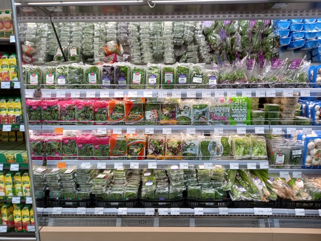 Ein breites Angebot an abgepackten Salatmischungen und frischen Kräutern