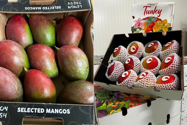 Links, brasilianische Palmer-Mango (Seetransport). Rechts, Kent-Mango aus Peru (Lufttransport)