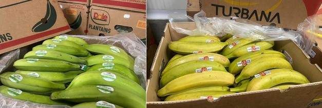 Links, Grüne Kochbananen aus Ecuador . Rechts, reife Kochbananen aus Kolumbien