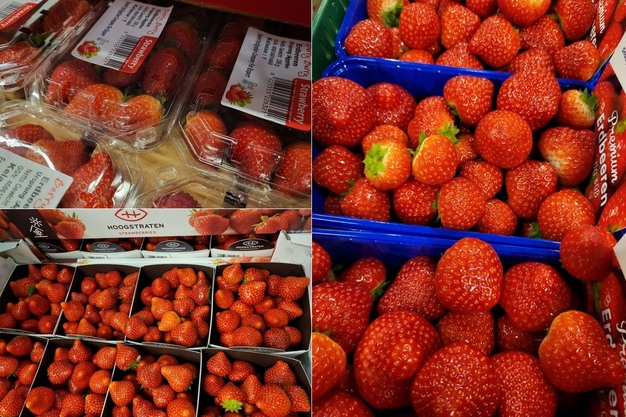 Einblick ins Erdbeersortiment der Fa. Dehmel. Im Uhrzeigersinn: Ägyptische Flugerdbeeren, niederländische Gewächshausware sowie belgische Gewächshauserdbeeren von Coöperatie Hoogstraten.