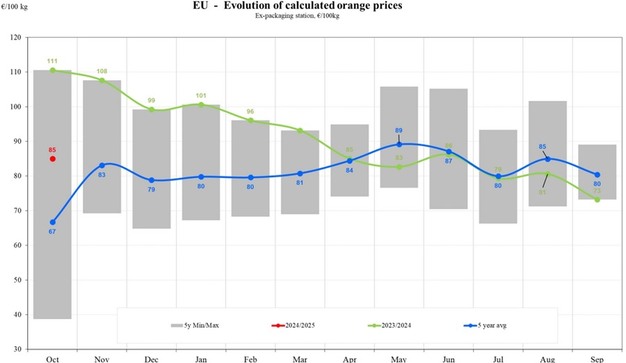 Der Zitrusmarkt in der EU hat in den einzelnen Mitgliedstaaten unterschiedliche Preisbewegungen gezeigt, die sowohl regionale Herausforderungen als auch allgemeinere Marktbedingungen widerspiegeln. Im Oktober 2024 lag der durchschnittliche EU-Preis für Orangen bei 85 EUR/100 kg, was einem Anstieg von 16,08 Prozent gegenüber September, aber einem deutlichen Rückgang von 26,26 Prozent gegenüber Oktober 2023 entspricht. Diese Diskrepanz unterstreicht ein komplexes Preisumfeld, das von schwankenden Nachfrage- und Angebotsfaktoren bestimmt wird.