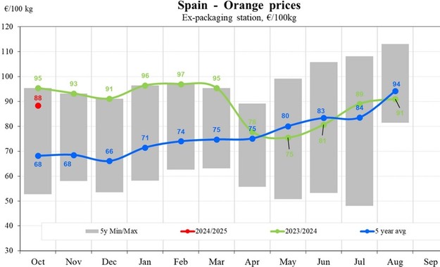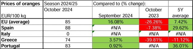 Portugal meldete im Oktober Orangenpreise von 83 EUR/100 kg, was einem bescheidenen Anstieg von 0,92 Prozent gegenüber dem Vormonat entspricht. Diese Preise liegen 36,01 Prozent über dem Fünfjahresdurchschnitt, was auf eine relativ stabile Marktleistung im Vergleich zu anderen EU-Ländern hindeutet. Im Gegensatz dazu meldete Italien für diesen Zeitraum keine spezifischen Orangenpreisdaten, was breitere regionale Vergleiche einschränkt.