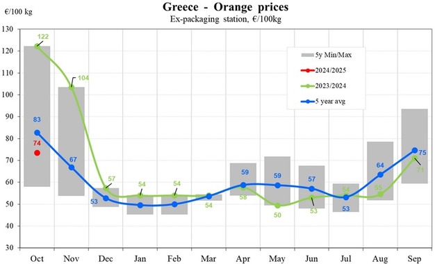 Spanien, einer der führenden Zitrusproduzenten in der Europäischen Union, verzeichnete Orangenpreise von 88 EUR/100 kg. Dies entspricht einem deutlichen Rückgang von 7,38 Prozent gegenüber dem Vorjahreszeitraum, obwohl die Preise immer noch 29,62 Prozent über dem Fünfjahresdurchschnitt liegen. In Griechenland fielen die Orangenpreise auf 74 EUR/100 kg, was einem starken Rückgang von 39,81 Prozent gegenüber dem Vorjahr und einem Rückgang von 11,12 Prozent gegenüber dem Fünfjahresdurchschnitt entspricht, was auf anhaltende Versorgungsprobleme und eine gedämpfte Marktnachfrage hindeutet.