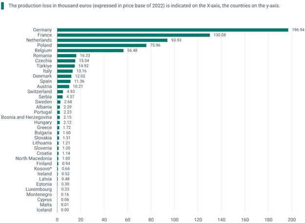 Belgien und Rumänien weisen mit Verlusten von 56,48 Millionen Euro bzw. 16,23 Millionen Euro eine deutliche Lücke zu den leistungsstärksten Ländern auf, zeigen aber dennoch erhebliche wirtschaftliche Störungen. Auch Länder wie Tschechien (15,34 Mio. EUR), die Türkei (14,92 Mio. EUR) und Italien (13,16 Mio. EUR) waren von erheblichen Auswirkungen betroffen, wenn auch in geringerem Maße als ihre westeuropäischen Pendants. Diese Zahlen unterstreichen, wie sehr die Höhe der Verluste, mit denen die einzelnen Länder konfrontiert sind, von den unterschiedlichen wirtschaftlichen und strukturellen Bedingungen in der Europäischen Union und den Nachbarregionen abhängt.