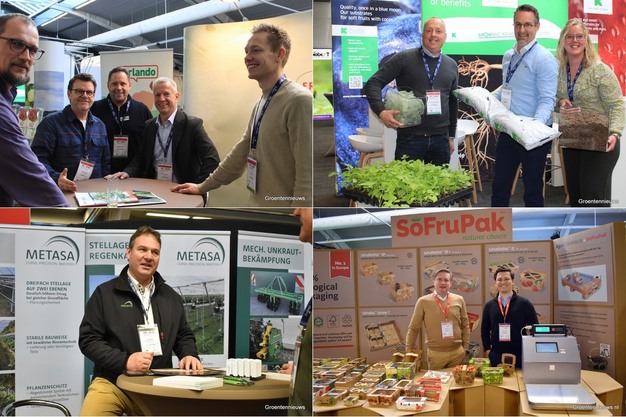 Aussteller auf der International Soft Fruit Conference 2025. Im Uhrzeigersinn: Das Team des Obstzüchters Fresh Forward, die dreiköpfige Vertretung von Klasmann-Deilmann, Adam Sikorski von SoFruPak und sein Landsmann und Gaschäftspartner Kacper Dach von Agrocontracts, Jörg Amft von Metasa.