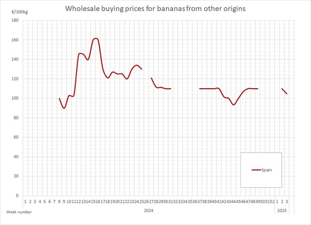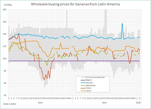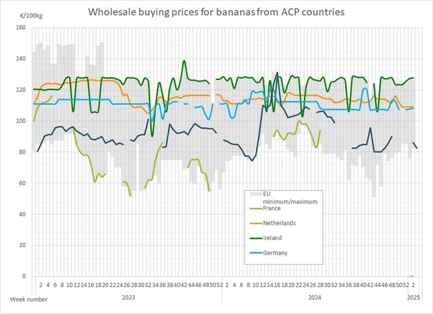 Die wöchentlichen Preise für Bananen in verschiedenen Ländern zeigen interessante Schwankungen, wobei in Spanien, Irland, den Niederlanden und der Slowakei bemerkenswerte Veränderungen zu beobachten sind. Ein Vergleich der Preise von der Woche bis zum 12. Januar 2025 mit der Woche bis zum 19. Januar 2025 zeigt unterschiedliche Trends in diesen Ländern.