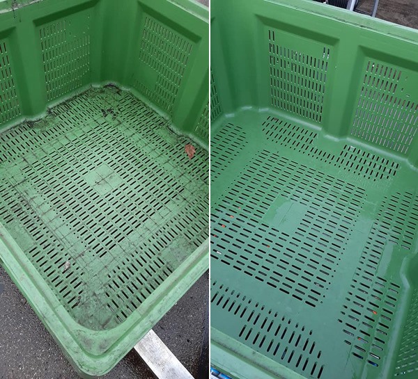 Das Waschen der Kisten verbreitete sich wie ein Lauffeuer und schon bald waren Stammkunden wie Van Ossenbruggen, Van Blijderveen, Oskam und Groda AGF begeistert. "Das Kistenwaschen bietet große Vorteile. So bleibt das Wasser im Wasserkipper sauberer und es wirkt auch dem Infektionsdruck entgegen", sagt der Obsterzeuger. "Da die Waschanlage auf Rädern steht, können wir die Kisten überall waschen. Wir bringen die Waschanlage auf dem Pritschenwagen hinter dem Lkw zum Standort des Erzeugers. Mit unserer selbstentwickelten mobilen Waschanlage für Lagerkisten fahren wir jetzt durch die ganzen Niederlande und Belgien. Wir nehmen unseren eigenen Gabelstapler mit und sind abgesehen von Strom und Wasser völlig autark. Und wenn nötig, bringen wir unseren eigenen Generator mit."