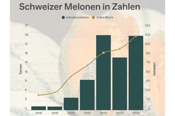 Schweizer Landwirtinnen und Landwirte produzierten im Jahr 2024 auf gut 12 Hektar rund 24 Tonnen Zuckermelonen, wie zum Beispiel Honigmelonen. Im Gegensatz zur importierten Menge von 27.155 Tonnen, ist die Menge verschwindet gering. Der Anbau dieser Südfrucht verzeichnet jedoch einen jährlichen Zuwachs.