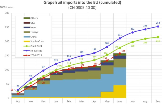 Der EU-Import von Pampelmusen belief sich im Juni 2025 auf 158 Tonnen und lag damit unter dem Wert der vorigen Saison (178 Tonnen). Südafrika lieferte 23,726 Tonnen, China 29 Tonnen und die Türkei 26 Tonnen. Die Einfuhren im Juni erreichten 24,963 Tonnen.