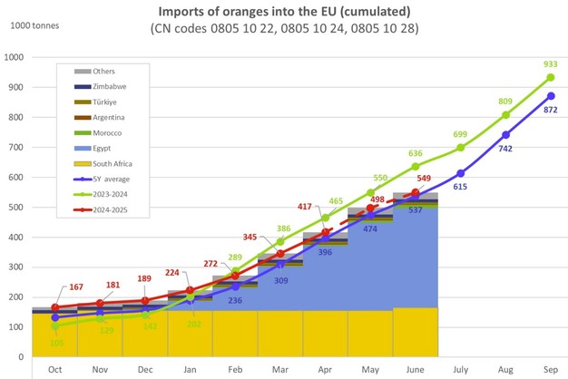 Im Juni 2025 beliefen sich die EU-Importe von Orangen für die Saison 2024-2025 auf 549 Tonnen und lagen damit unter den 636 Tonnen der Saison 2023-2024. Südafrika lieferte 9,973 Tonnen, Ägypten 37,785 Tonnen und Marokko 3,127 Tonnen. Weitere Lieferanten waren die Türkei (9 Tonnen), Argentinien (96 Tonnen) und Simbabwe (9,850 Tonnen). Die monatlichen Importe im Juni beliefen sich auf 51,413 Tonnen, und der Durchschnittspreis lag bei 111 EUR/100 kg.