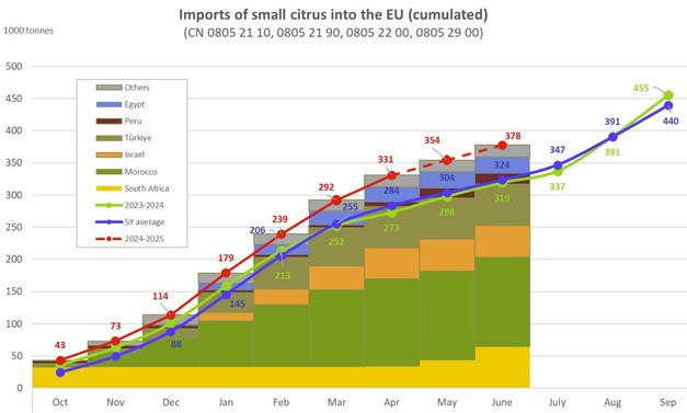 Der Import von Mandarinen und Clementinen in die EU belief sich im Juni 2025 auf 378 Tonnen, gegenüber 319 Tonnen im Vorjahr. Südafrika lag mit 21,130 Tonnen an der Spitze, gefolgt von Peru (2,118 Tonnen). Der monatliche Import im Juni beliefen sich auf 23,642 Tonnen, bei einem Durchschnittspreis von 94 EUR/100 kg.