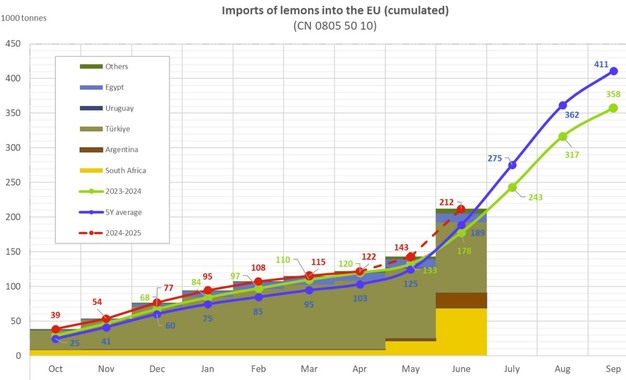 Die Zitronenimporte beliefen sich bis Juni 2025 auf insgesamt 212 Tonnen, verglichen mit 178 Tonnen im Zeitraum 2023–2024. Die wichtigsten Lieferanten waren die Türkei (135 Tonnen), Südafrika (47,477 Tonnen) und Argentinien (18,203 Tonnen). Die Importe im Juni beliefen sich auf 69,081 Tonnen, der Durchschnittspreis lag bei 122 EUR/100 kg.