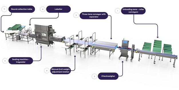 Für Aktivitäten, bei denen nur eine minimale Sortierung erforderlich ist und lediglich eine Gewichtskontrolle oder Umverpackung notwendig ist, bietet die dynamische Wiegelinie eine halbautomatische Alternative, erklärt Milewski. „Dieses System verwendet eine Kontrollwaage und ein dreispuriges Förderband mit einem Wechsler, der die Verpackungen automatisch nach Gewicht sortiert. Nur Verpackungen, die nicht das richtige Gewicht haben, werden zur manuellen Anpassung umgeleitet. Sobald das Gewicht stimmt, gelangen die Verpackungen zur nächsten Phase. Mit ihrer kompakten Bauweise ist die dynamische Linie eine attraktive Option für Packstationen mit begrenztem Platzangebot. Sie reduziert die Arbeitsbelastung des Bedieners erheblich, da er sich nur noch um das Hinzufügen oder Entfernen von Obst kümmern muss, anstatt vollständige Gewichtskontrollen durchzuführen."