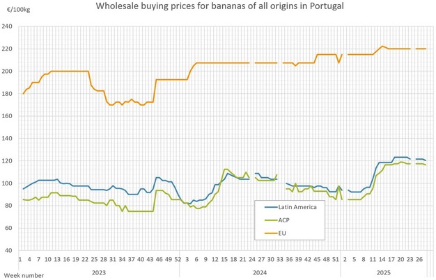 Im Gegensatz dazu war die Slowakei das einzige Land unter den ausgewählten Ländern, das einen Preisanstieg verzeichnete. Die Bananenpreise stiegen von 106 EUR/100 kg auf 115 EUR/100 kg, ein Plus von 9 EUR gegenüber der Vorwoche.