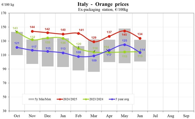 Italien meldete die höchsten Orangenpreise der vier Länder. Im April lag der Preis bei 137 EUR pro 100 kg, stieg im Mai auf 145 EUR – den Höchststand der Saison – und fiel dann im Juni leicht auf 134 EUR. Diese Preise liegen deutlich über dem Fünfjahresdurchschnitt, was auf eine anhaltende Stärke des italienischen Zitrusmarktes hindeutet.