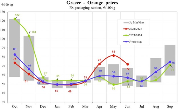 In Griechenland war die Preisentwicklung moderater. Im April 2025 wurden Orangen für 72 EUR pro 100 kg verkauft. Im Mai stiegen die Preise auf 82 EUR, bevor sie im Juni wieder auf 72 EUR fielen. Trotz dieses kurzen Aufschwungs blieben die Preise nahe am Durchschnitt der letzten fünf Jahre und unter den Spitzenwerten von 2023/2024.