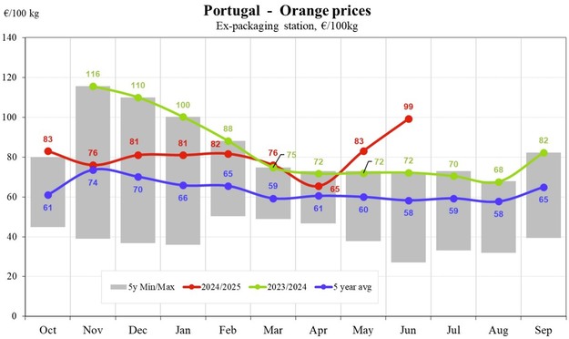 In Portugal stiegen die Preise im gesamten Frühjahr deutlich an. Sie begannen im April bei 65 EUR pro 100 kg, stiegen im Mai auf 83 EUR und erreichten im Juni 99 EUR. Dies ist eine bemerkenswerte Erholung gegenüber den Zahlen der letzten Saison und macht Portugal in diesem Jahr zu einem der leistungsstärksten Lieferanten von Orangen in Südeuropa.