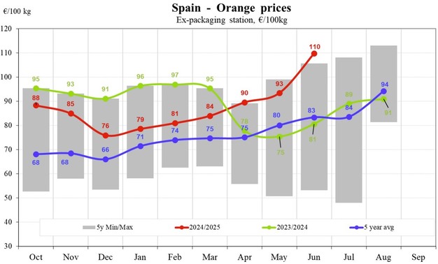 In Spanien stiegen die Orangenpreise im Frühjahr 2025 weiter an. Der Preis lag im April bei 90 EUR pro 100 kg, im Mai bei 93 EUR und erreichte im Juni einen Höchststand von 110 EUR. Mit diesem Anstieg liegen die spanischen Preise deutlich über dem Fünfjahresdurchschnitt und den Zahlen der letzten Saison, was auf ein begrenztes Angebot und möglicherweise eine starke Nachfrage zum Ende der Verkaufssaison hindeutet.